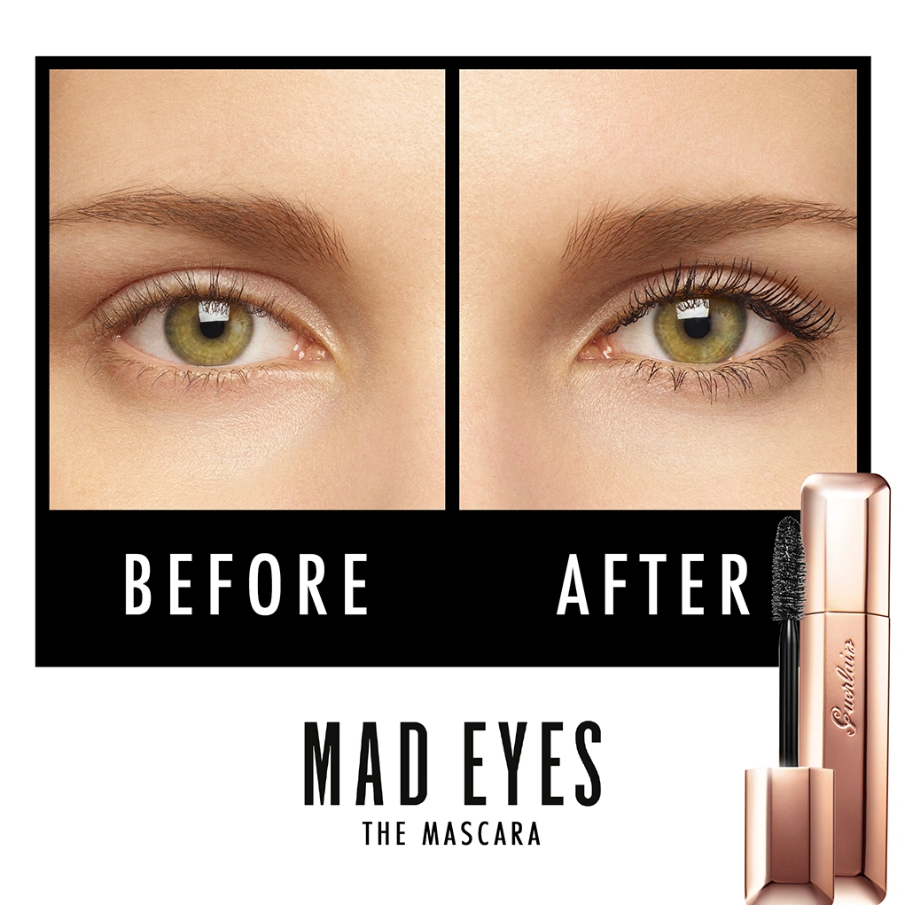מסקרה מד אייז Mad Eyes מבית Guerlain, היא מסקרה ווליום וטיפוח למראה ריסים מופרדים מעצימה את העיניים באופן משמעותי ומספקת נפח מיידי מדהים שחור, עמוק ודרמתי. הריסים צפופים יותר, ארוכים יותר ומסולסלים יותר למשך 24 שעות. מסקרה עמידה למים, מטפחת את הריסים