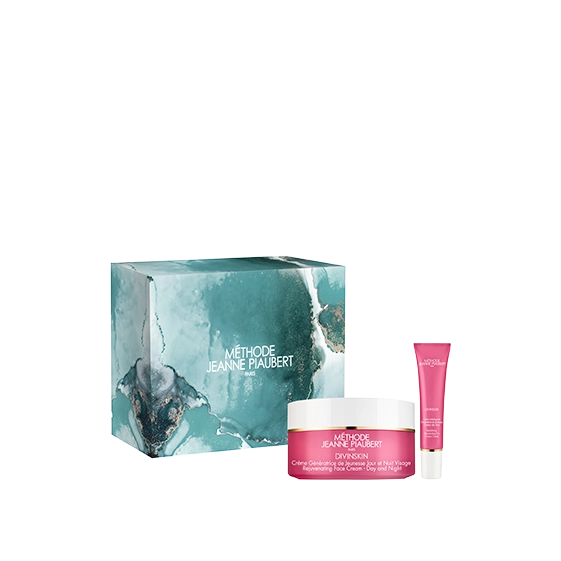 הסט דיווין סקין מבית Méthode Jeanne Piaubert. מכיל קרם פנים ליום ולילה, המרקם של הקרם העשיר נספג בעדינות אל תוך העור ומשאיר גימור רך. הקרם פועל בהדרגה על פני שכבת העור ומשחזר את גמישותו - מסייע בהחלקת קמטים וקווים עדינים, ריח הקרם מועשר בתמציות פרחים וניחוח מאסק.50 מ"ל. וקרם עיניים לשימוש עור צעיר בתחילת דרכו בשגרות הטיפוח. מסייע בהקטנת נפיחויות ועיגולים כהים הנוצרים סביב אזור העיניים. מסייע בהחלקת קווים עדינים שנוצרים כתוצאה מעישון או מכיווצי הפנים.15 מ"ל.