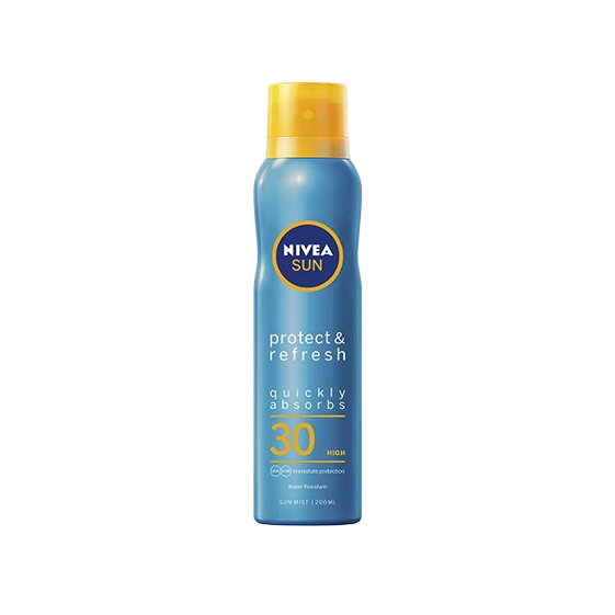 ספריי הגנה מפני השמש SPF30 מבית Nivea, תרסיס ההגנה של Nivea מעניק אפקט קירור מהנה ומשאיר את העור רענן. אינו מותיר שכבה לבנה,בעל נוסחה שקופה 100% אינו שומני ונספג במהירות. התרסיס מכיל מסנני הגנה UVA/UVB.